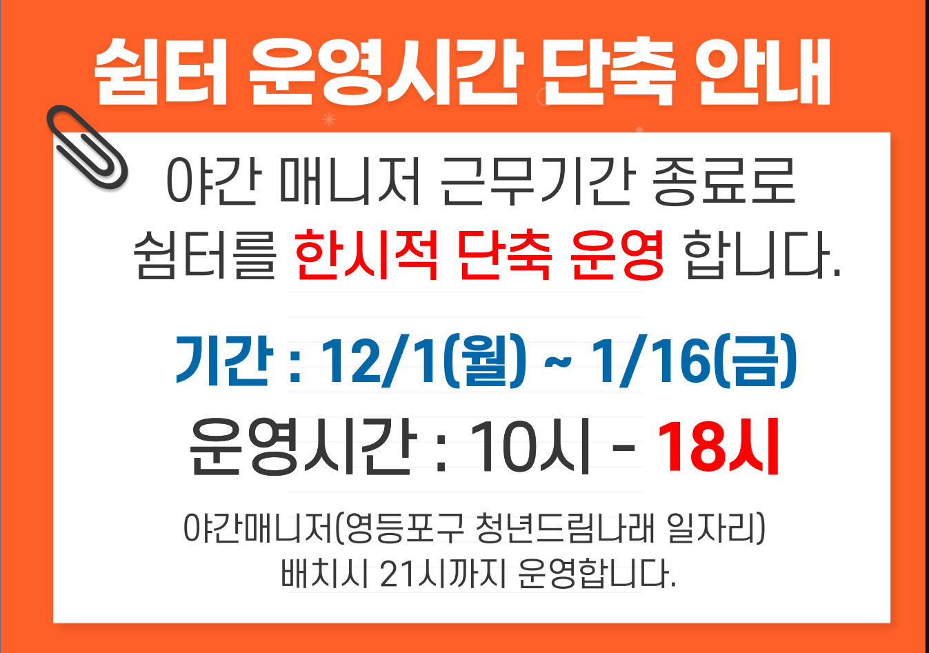 - 단축운영 기간 : 25년 12/1(월) ~26년 1/16(금)- 단축운영 시간 : 오전10시 ~ 오후6시