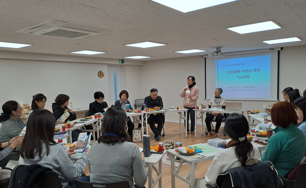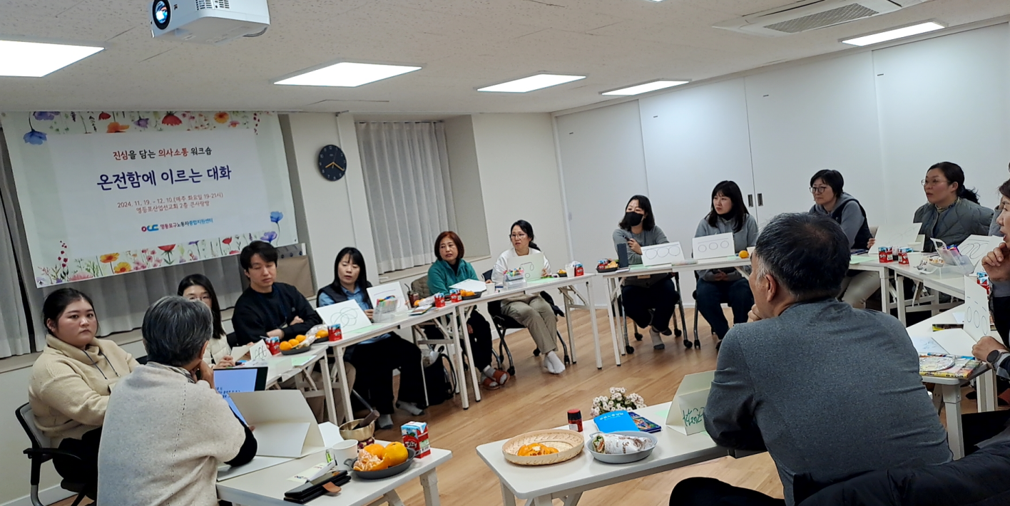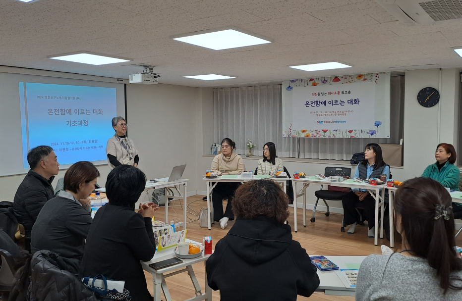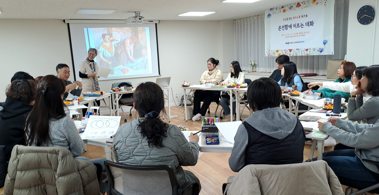 이번 시간에 새롭게 의미있게 다가온 것이 무엇이든, 앞으로 일주일 동안 그것을 떠올리며 자신의 생각과 의사소통의 변화를 느껴보시라고 권해드렸다. 참여형, 실습형 교육이 처음이신 분들, 강사를 중심으로 일렬로 앉는 배치가 아니라 서로 서로를 볼 수 있는 원형 배치가 쑥스러운 분들이 있었겠지만 마치고 돌아가시는 모습은 한결 가벼워져 있었다. 다음 주 더 깊어진 만남을 기대하며 마무리를 지었다.