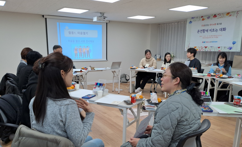 가운데 꽃과 초가 놓인 센터피스를 중심으로 책상들이 둥글게 놓여 있다. 입구테이블에는 맛있는 간식과 과일, 차가 가지런히 세팅되어 세심하게 참가자들을 환대하는 센터의 마음을 잘 보여주고 있다.