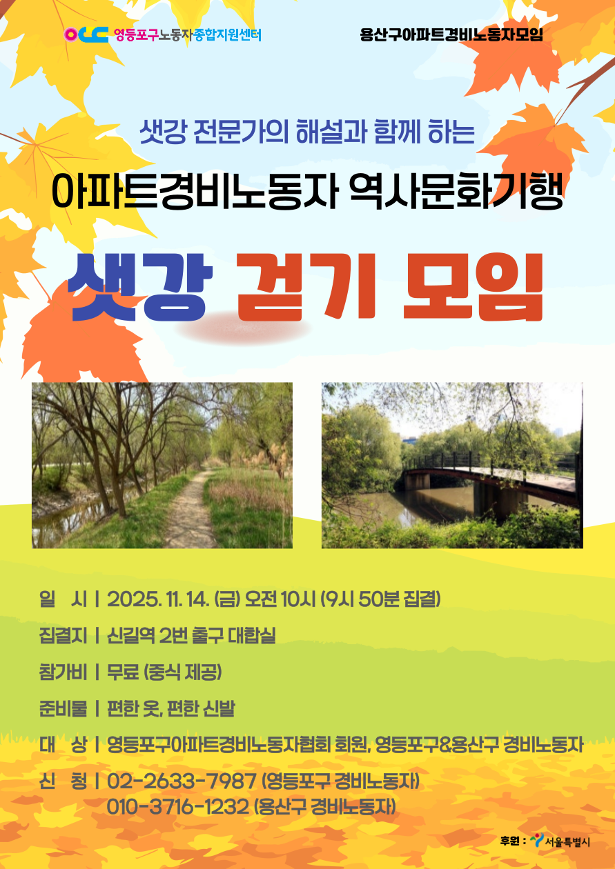 혹시 신청을 깜빡하셨다면 바로 지금~!! 신청해주세요. 02-2633-7987로 '샛강 걷기' 메시지와 함께 이름과 전화번호를 보내주시면 됩니다.